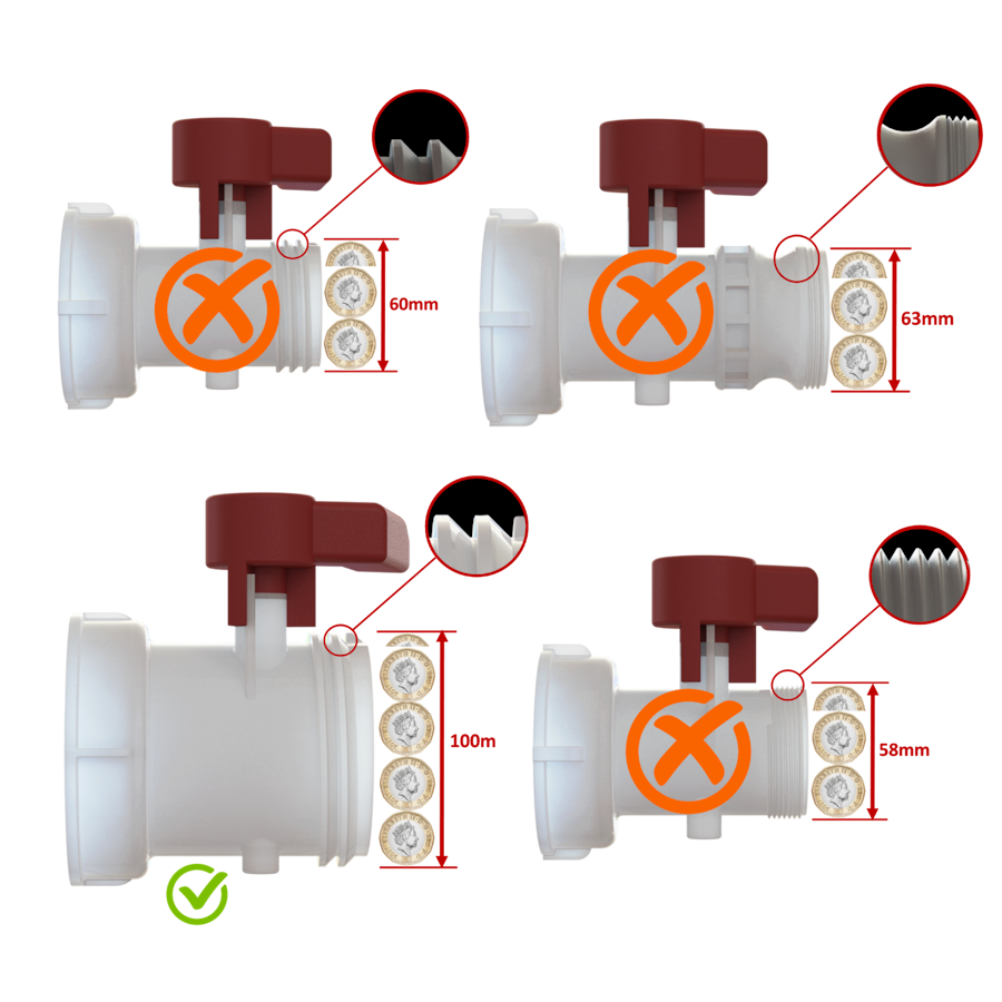 S100X8 (3'' or DN 80) female buttress with seal to IBC S60X6 thread , connects 1000L IBC tank to a IBC S60X6 (2" or DN 50) male buttress thread